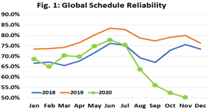 Global schedule reliability dropped to a record low of 50.1% in November, according to statistics released by Sea-Intelligence.
