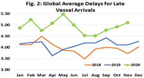 “Compared to November 2019, schedule reliability is -29.8 percentage points lower, and it’s the fourth consecutive month that we have recorded a double-digit Y/Y decline,” says Murphy. There’s been a similar trend with the average delay for late vessel arrivals, he adds, which have recorded consecutive M/M increases for the past three months, reaching 5.10 days in November. “The 2020 figure for the average delay for late vessel arrivals has been the highest overall in each month since April 2020.”