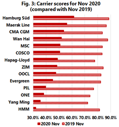 In November, Hamburg Süd was the most reliable carrier, recording 61.5% reliability. However, it’s evident in figure 3 how significant the deterioration is compared to November 2019. Only Cosco and OOCL recorded a M/M improvement, whereas none of the carriers recorded a Y/Y improvement. Hamburg Süd recorded the smallest decline of a staggering -27.0 percentage points.