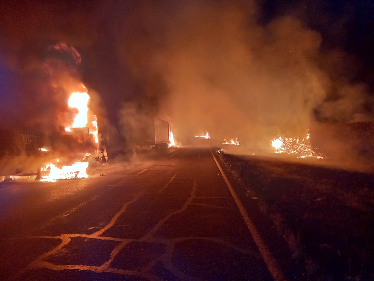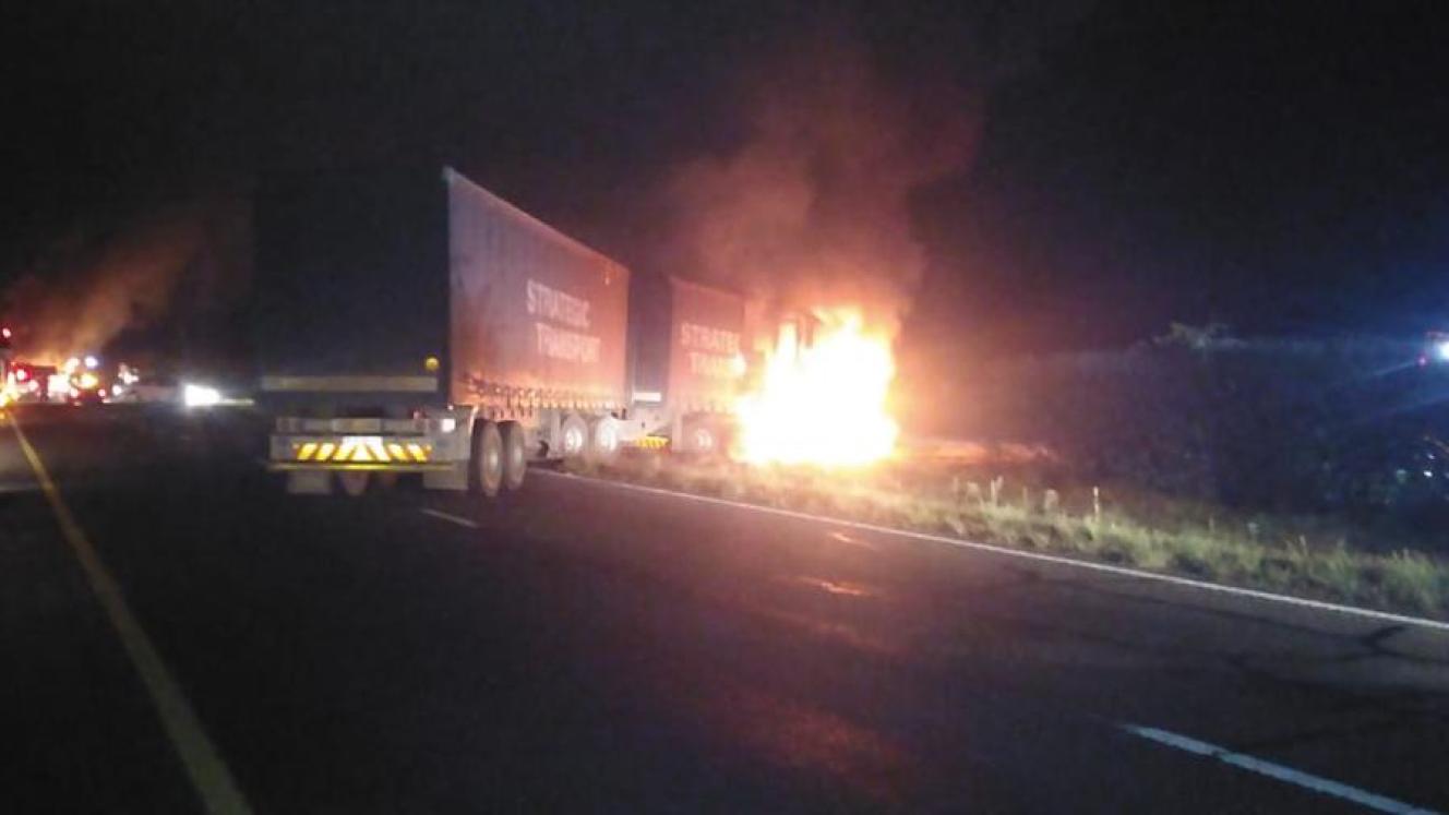 In one of the most violent nights for South Africa’s road transport sector since arson attacks became the method for xenophobic labour activism a few years ago, 10 trucks were set alight on the R103 and N3 close to the R23 interchange north of Heidelberg.