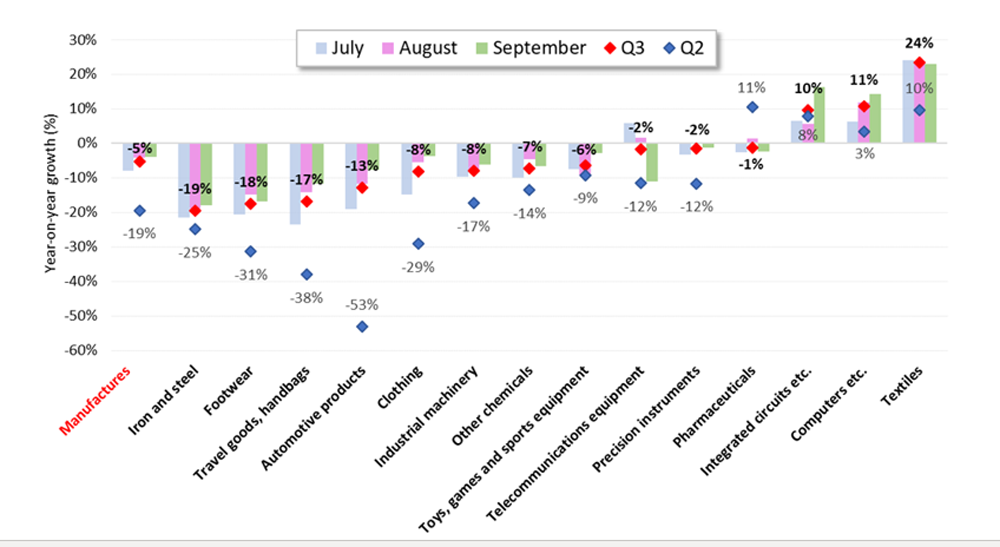 Trade in manufactured goods was down 5% year-on-year in the quarter from July to September, much closer to pre-pandemic trade levels than the second quarter's 19% shortfall. Computers and electronic components saw double-digit trade growth, as did shipments of textiles, which were boosted by demand for face masks.