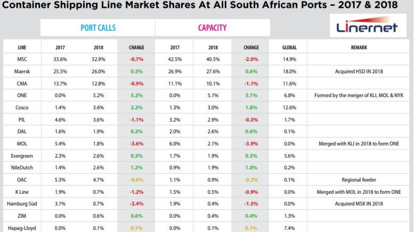There are some interesting anomalies in the share of container traffic of the major shipping lines at South African ports compared to their global market penetration. Calculations by Linernet show that, while MSC vessels accounted for 33% of South African port calls in 2018, the line has a 15% share of the international container market, according to Alphaliner calculations.