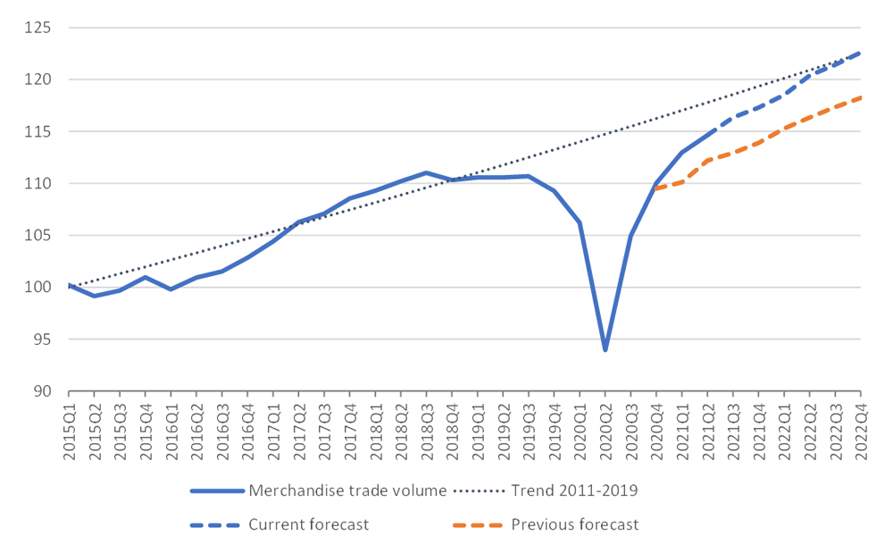 The large annual growth rate for merchandise trade volume in 2021 is mostly a reflection of the previous year's slump, which bottomed out in the second quarter of 2020. Due to a lower base, year-on-year growth in the second quarter of 2021 was 22.0%, but the figure is projected to fall to 10.9% in the third quarter and 6.6% in the fourth quarter, in part because of the rapid recovery in trade in the last two quarters of 2020. Reaching the forecast for 2021 only requires quarter-on-quarter growth to average 0.8% per quarter in the second half of this year, equivalent to an annualised rate of 3.1%.
