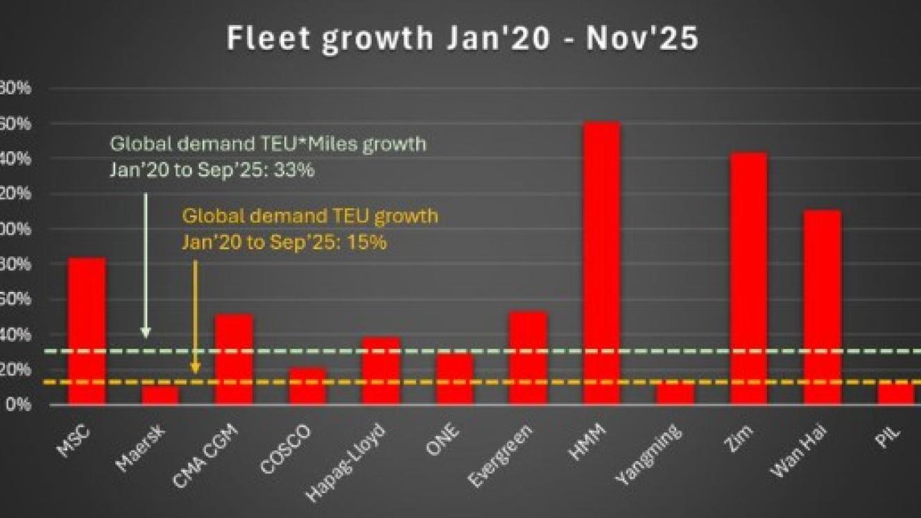 Global demand measured in TEU has grown by 15% from January 2020 to September 2025, he says, while demand measured in TEU miles has increased by 33%, largely due to the Red Sea crisis diverting cargo around Africa.