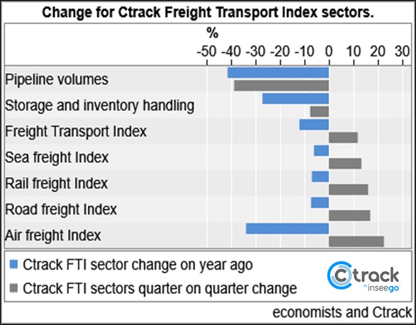 Looking at the results on a sector by sector basis, airfreight experienced the strongest quarterly recovery. The 22.5% improvement quarter on quarter is significant but still leaves this sector down 33.9% compared to the same quarter last year.