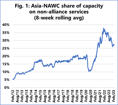 “On Asia-North America East Coast, there was a similar trend of increasing non-alliance capacity as the market initially strengthened. However, even though there is a distinct decline coming into 2023, there is no sign presently that we are about to go back to pre-pandemic levels.