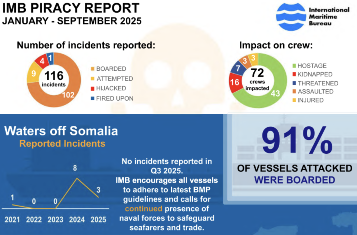 IMB’s Piracy Reporting Centre reported 116 incidents for the period January-September 2025, up from 79 in the same period last year, the highest reported nine-month figures since 2021.