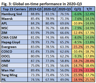 Global schedule reliability in 2020‑Q3 has plummeted to 65.0%, according to Sea‑Intelligence. This is the lowest-ever quarterly decline recorded by the maritime consultancy - and is lower by a considerable ‑14.6 percentage points Y/Y, says CEO Alan Murphy.
