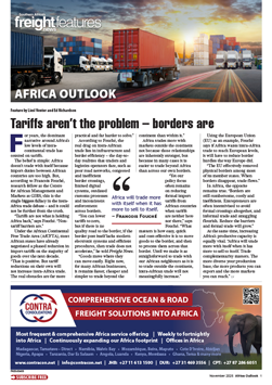 13 Nov 2025 View PDF Logistics hubs helping to reduce cost of trade 18 Nov 2025 Range of security strategies keeps drivers safe 18 Nov 2025 Cape to Cairo rail vision still a work in progress 18 Nov 2025 Finding lasting solutions to complex problems 18 Nov 2025 Private sector raises port productivity 18 Nov 2025 Logistics operators adapt in countries at war 18 Nov 2025 Border crossings remain the biggest challenge 18 Nov 2025 Paper on the way out at border posts 18 Nov 2025 FDI momentum not sustained 18 Nov 2025 NVOCC capitalises on regional expansion 18 Nov 2025 Drones being deployed for border security 18 Nov 2025 Trans-African Highway 4 remains under construction 18 Nov 2025 Ghana glows golden in Ecowas 18 Nov 2025 Driving digital integration a top priority 18 Nov 2025 Countries succeeding in the fight against corruption 18 Nov 2025 Changes in global aid the biggest shift 18 Nov 2025 Multi-corridor option provides flexibility 18 Nov 2025 Tariffs aren’t the problem – borders are 17 Nov 2025