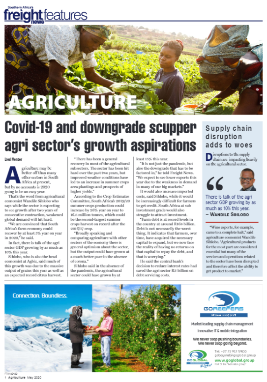 7 May 2020 View PDF Land reform remains contentious as ever 7 May 2020 Logistics operator upbeat as mechanisation rises 7 May 2020 Fertilizer volumes on the rise as region turns to agriculture 7 May 2020 Travel bans put a hold on new market access 7 May 2020 Contingency plans in place as fruit inspections continue 7 May 2020 The glass half full – growth and cost-saving opportunities 7 May 2020 Covid-19 and downgrade scupper agri sector’s growth aspirations 7 May 2020