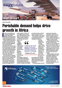 11 Jan 2024 View PDF End to falling rates uncertain 11 Jan 2024 Upswing on SA-Latin American route predicted 11 Jan 2024 2024 could be a fresh start for the industry 11 Jan 2024 Tiaca head optimistic for year ahead 11 Jan 2024 Sea freight congestion boosts airfreight sector 11 Jan 2024 2024 growth forecast 11 Jan 2024 Perishable demand helps drive growth in Africa 11 Jan 2024