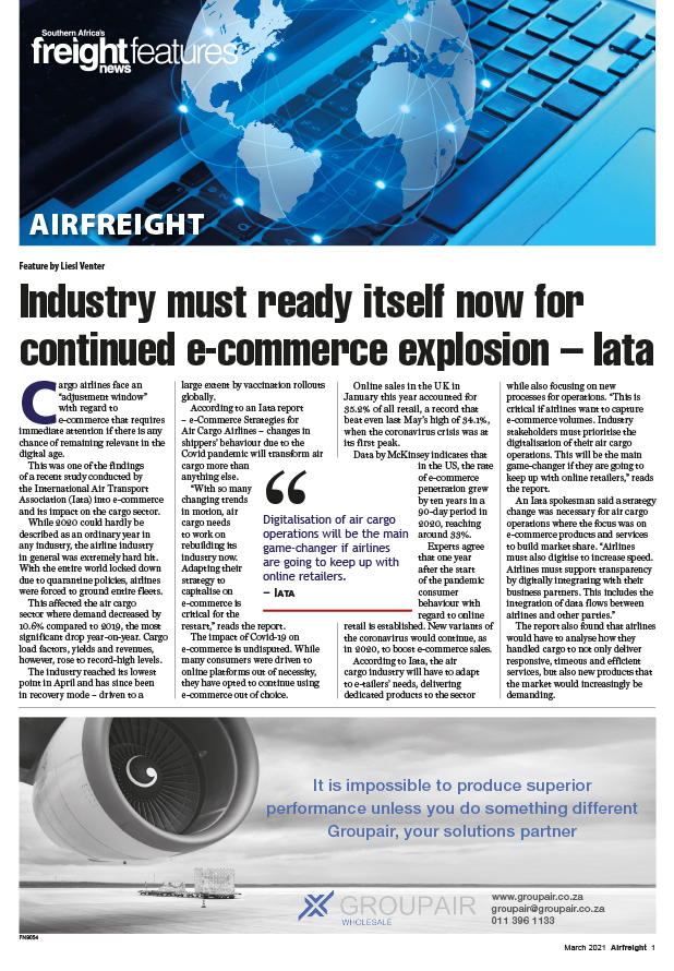 11 Mar 2021 View PDF March 2021 Airfreight 3FN9025The festive season is about love and getting the chance to enjoy it. The people you love. The places you love. The things you love and we’re here to make sure that you get to savour every moment of it by delivering you, your 11 Mar 2021 Rates unlikely to decrease any time soon 11 Mar 2021 Expanding service range and celebrating 27 years 11 Mar 2021 Industry must ready itself now for continued e-commerce explosion – Iata 11 Mar 2021