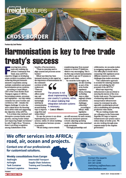 19 Mar 2024 View PDF Free trade treaty gains ground, propelling business on the continent 19 Mar 2024 BMA celebrates a successful first year 19 Mar 2024 SADC enhances logistics with multifaceted approach 19 Mar 2024 Leveraging opportunities is key for road freight sector to grow 19 Mar 2024 SACU remains Namibia’s largest market 19 Mar 2024 Enhanced border operations drive trade growth 19 Mar 2024 New agreement beefs up permit checks, compliance 19 Mar 2024 Border post upgrades enhance efficiency 19 Mar 2024 Digital permits: the wait is almost over 19 Mar 2024 Leschaco unlocks new opportunities for growth 19 Mar 2024 A transparent, tech-savvy customs process will improve cargo flow 19 Mar 2024 Harmonisation is key to free trade treaty’s success 19 Mar 2024