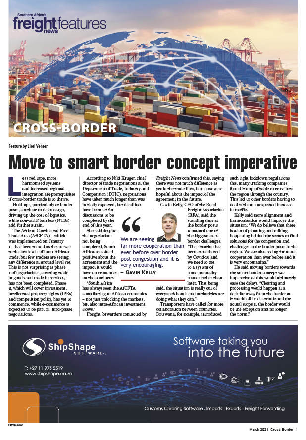 25 Mar 2021 View PDF Raising women’s voices in Africa 25 Mar 2021 Aarto poses conundrum for foreign drivers 25 Mar 2021 Industrialisation needed to grow cross-border trade 25 Mar 2021 Public-private-partnerships critical to success at border posts 25 Mar 2021 Investing in warehouse capacity to prepare for future demand 25 Mar 2021 Port of Maputo’s investment strategy paying off 25 Mar 2021 Cross-Border6 Cross-Border March 2021FTW8936+27 (0)11 028 1181 | info@nucleusml.co.zaTransportWarehousingProject Management Consolidation LoadsYOUR SUPPLY CHAIN PARTNERinto remote AfricaTailor-made solutions for the mining and oil & gas industriesNucl 25 Mar 2021 Mining sector adds momentum to growth 25 Mar 2021 Smooth border flow demands regional buy-in on Covid guidelines 25 Mar 2021 Rollout of harmonised e-solutions critical 25 Mar 2021 Rail inefficiencies force switch to road 25 Mar 2021 Delivering end-to-end air cargo solutions 25 Mar 2021 AfCFTA – an opportunity for Africa to improve cross-border operations 25 Mar 2021 Move to smart border concept imperative 25 Mar 2021