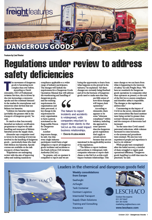 21 Oct 2021 View PDF Safety and training remain top priority 21 Oct 2021 Leschaco South Africa opens tank container division 21 Oct 2021 Growing presence in the chemical industry 21 Oct 2021 Dangerous Goods 1Regulations under review to address safety deficiencies 21 Oct 2021