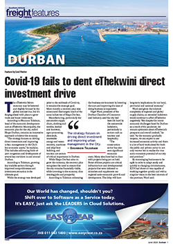 11 Jun 2020 View PDF Covid-19 fails to dampen Dube SEZ’s growth ambitions 11 Jun 2020 Battered trucking industry needs to reset and refocus 11 Jun 2020 Durban puts export growth front and centre 11 Jun 2020 Dube remains catalyst for economic development 11 Jun 2020 Port of Durban decongestion efforts bearing fruit 11 Jun 2020 Motlohi acknowledges Durban’s precarious ‘preferred port’ position 11 Jun 2020 ‘Port productivity key to honouring commitments to customers’ 11 Jun 2020 Expect a spike in cargo theft as Covid disrupts supply chains 11 Jun 2020 Province makes great strides in improving air access 11 Jun 2020 Durban’s port manager speaks out on his hopes and challenges 11 Jun 2020 Covid-19 fails to dent eThekwini direct investment drive 11 Jun 2020