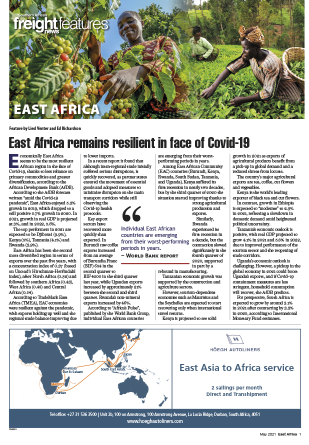13 May 2021 View PDF Liner ramps up service as volumes continue to grow 13 May 2021 A ‘good news’ story 13 May 2021 Economic diversification – time to redouble efforts 13 May 2021 Kenya continues digitisation journey 13 May 2021 Finland commits €10.5 million to support regional trade 13 May 2021 Region’s biggest port ups productivity 13 May 2021 Pipeline could be a game-changer 13 May 2021 Whopping 35% decline in projects 13 May 2021 Dar es Salaam port geared for 43% growth 13 May 2021 Developing final-mile solutions in the region 13 May 2021 East Africa remains resilient in face of Covid-19 13 May 2021