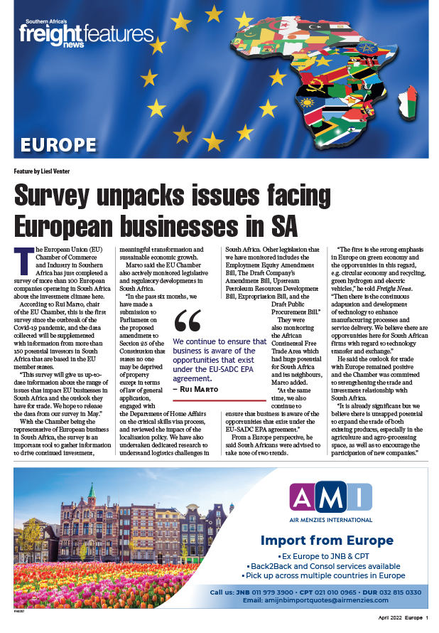14 Apr 2022 View PDF Sea freight capacity remains constrained 14 Apr 2022 Increase in compliance costs inevitable for exporters 14 Apr 2022 Wine exporters aim for pre-Covid volumes 14 Apr 2022 Growing cost of fuel pushes up airfreight rates 14 Apr 2022 Survey unpacks issues facing European businesses in SA 14 Apr 2022