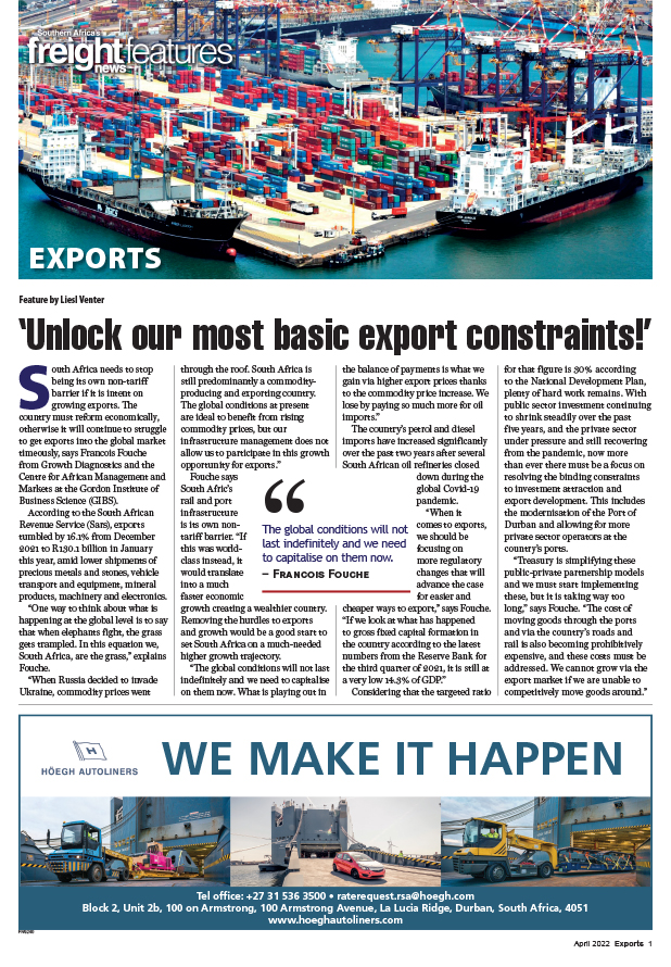 31 Mar 2022 View PDF Africa must address Asian trade imbalance 31 Mar 2022 April 2022 Exports 3Lower carrier capacity continues to plague our ports 31 Mar 2022 2022 outlook for exports is positive 31 Mar 2022 Airfreight export volumes benefit from troubles at sea 31 Mar 2022 ‘Unlock our most basic export constraints!’ 31 Mar 2022
