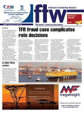 10 Apr 2015 Demand for mega carriers down 10 Apr 2015 AIRLINE BRIEFS 10 Apr 2015 Why people 'cheat' in the workplace 10 Apr 2015 SAA moves to Abu Dhabi hub 10 Apr 2015 City of CT to grill Sanral on toll fees 10 Apr 2015 TFR fraud case complicates rate decisions 10 Apr 2015 Airlines want buy-in from forwarders and shippers 10 Apr 2015 Airlines address cold chain demands on the ground 10 Apr 2015 Shipping companies offloading logistics arms 10 Apr 2015 TPT pleads terms and conditions 10 Apr 2015 8 200- TEU caller 10 Apr 2015 Spate of robberies at Ortia 10 Apr 2015 LAST WEEK'S TOP STORIES ON FTW ONLINE 10 Apr 2015 DUTY CALLS 10 Apr 2015 Online deliveries create new demands 10 Apr 2015 Automotive specialist set to diversify 10 Apr 2015