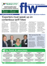 11 Mar 2011 View PDF DUTY CALLS 11 Mar 2011 ‘Exporters must speak up on contentious tariff hikes’ 11 Mar 2011 Science fiction in action! 11 Mar 2011 New airport improves efficiencies 11 Mar 2011 Final design of Kazungula bridge ready for approval 11 Mar 2011 ‘SA safe from piracy’ 11 Mar 2011 Lighter pallets translate into cost savings 11 Mar 2011 Learning more about Incoterms®2010 11 Mar 2011 Stellenbosch forum draws packed house 11 Mar 2011 ‘Could cause chaos in the workplace’ 11 Mar 2011 ‘Labour law amendments threaten global competitiveness’ 11 Mar 2011 Be aware of the Customs implications of trade discounts 11 Mar 2011 Service levels sweep to top of supply chain priority list 11 Mar 2011 Smaller markets make challenges manageable 11 Mar 2011 ‘People on the ground’ are key to overcoming challenges 11 Mar 2011 Road traffic amendments under scrutiny 11 Mar 2011 Shortage of aircraft challenges industry 11 Mar 2011 More services from DAL 11 Mar 2011 Additional freighter capacity welcomed 11 Mar 2011 Strict handover protocols limit airfreight risk 11 Mar 2011 Failure of rail forces focus to corridors 11 Mar 2011 SAA adds capacity on Nairobi route 11 Mar 2011 Sars modernisation will rule out collusion with inspectors 11 Mar 2011 ‘Industry needs co-ordinated approach to training’ 11 Mar 2011 Flood-ravaged Brisbane gets ready to dredge 11 Mar 2011 Transporters should gear up for Africa growth 11 Mar 2011 Iata predicts ‘break even’ for Africa 11 Mar 2011 TFR rail hikes raise industry ire 11 Mar 2011 Favourable rates attract more airfreight business 11 Mar 2011