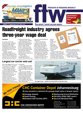 11 Sep 2015 View PDF Revitalised branch line carries first reefer 11 Sep 2015 More one-stop border posts on the cards 11 Sep 2015 Roadfreight industry agrees three-year wage deal 11 Sep 2015 RFA sets fire to corruption 11 Sep 2015 DoT backtracks on ‘no licences for e-toll delinquents’ 11 Sep 2015 Creating portals for transformation 11 Sep 2015 Largest car carrier sets sail 11 Sep 2015 Incoterms clarity 11 Sep 2015 DUTY CALLS 11 Sep 2015 Dangerus goods legislation withdrawn 11 Sep 2015 Africa network adds value for European shippers 11 Sep 2015 AIRFREIGHT BRIEFS 11 Sep 2015 Africa's air cargo sector to grow 5% annually 11 Sep 2015 Bad roads blamed for shocking Swazi crash 11 Sep 2015 New Customs acts pose major licensing dilemma 11 Sep 2015 Domestic carrier expects increased export shipments 11 Sep 2015 DCT pilots new truck management system 11 Sep 2015 Strong African network underpins growth 11 Sep 2015 SA/Africa lead in e-air waybill adoption 11 Sep 2015 LAST WEEK'S TOP STORIES ON FTW ONLINE 11 Sep 2015 It’s all about people 11 Sep 2015 Pier 2 access road to get major facelift 11 Sep 2015 Air infrastructure needed to boost intra-trade 11 Sep 2015
