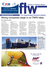 12 Apr 2013 View PDF 'One-stop shop agreement' 12 Apr 2013 Fabiola takes over ‘largest’ trophy 12 Apr 2013 Port of CT addresses wind-related delays 12 Apr 2013 DUTY CALLS 12 Apr 2013 Africa's remote destinations a 'lucrative' proposition 12 Apr 2013 Questions raised over timing of new dig-out port 12 Apr 2013 Smallbone moves up 12 Apr 2013 Samsa on track to acquire two tall ships 12 Apr 2013 Gloves off in CT toll tiff 12 Apr 2013 LAST WEEK'S TOP STORIES ON FTW ONLINE 12 Apr 2013 Africa comes out tops in logistics survey 12 Apr 2013 Swaziland weighbridge into operation 12 Apr 2013 Customs Services moves in on cross-border project cargo market 12 Apr 2013 JV creates new SA agency 12 Apr 2013 CT-Angola ro-ro service launched 12 Apr 2013 Ethiopian Arilines adds destinations 12 Apr 2013 Mining companies weigh in on TNPA hikes 12 Apr 2013 Airfreight industry welcomes e-freight breakthrough 12 Apr 2013