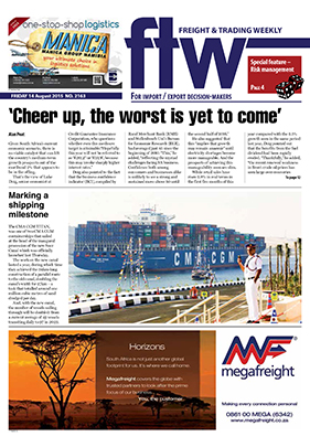 14 Aug 2015 View PDF Expect to pay carbon tax by mid-2016 14 Aug 2015 Protect against bad debt 14 Aug 2015 ‘Cheer up, the worst is yet to come’ 14 Aug 2015 New customs legislation unlikely before 2017 14 Aug 2015 Marking a shipping milestone 14 Aug 2015 African markets up their import standards 14 Aug 2015 Shipping lines in the driving seat as ports lose power 14 Aug 2015 SA headed for 'biggest tax rate increase' 14 Aug 2015 Holistic approach necessary 14 Aug 2015 Modal shift to rail would mitigate cargo risk 14 Aug 2015 Swazi Customs gets a dubbing 14 Aug 2015 New 'creditors' product insures clients 'debtors' books 14 Aug 2015 Climate change could cost marine insurance industry millions 14 Aug 2015 Supply chain visibility crucial to risk mitigation 14 Aug 2015 DUTY CALLS 14 Aug 2015 LAST WEEK'S TOP STORIES ON FTW ONLINE 14 Aug 2015 Swaziland turns to Africa as global doors close 14 Aug 2015