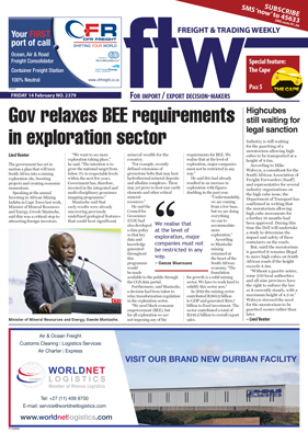 11 Feb 2020 View PDF Guardforce and Acsa in talks 11 Feb 2020 Ramokgopa outlines strategy to make business easier for investors 11 Feb 2020 Last week's top stories 11 Feb 2020 Crumbling Eswatini roads hamstring hauliers 11 Feb 2020 Eskom hanging by a thread 11 Feb 2020 Inefficiencies on the north-south line once more exposed 11 Feb 2020 Western Cape sets itself trade target 11 Feb 2020 Zambian radiation fees draw ire from industry 11 Feb 2020 Forum will oversee freight initiatives 11 Feb 2020 Collaboration key to modal shift 11 Feb 2020 Fuel shortages causemassive vessel delays 11 Feb 2020 Absence of funding hamstrings exporters 11 Feb 2020 WC government devises coherent freight strategy 11 Feb 2020 Isuzu joins trek into Africa 11 Feb 2020 Transnet mum over steep increases intended for iron-ore line to Ngqura 11 Feb 2020 Manganese plans rerouted 11 Feb 2020 New Ngqura tank farm could become fuel distribution hub 11 Feb 2020 LCL operator plugs gap with direct services 11 Feb 2020 New product an X-factor for clearing ease 11 Feb 2020 New Transnet CEO faces uphill challenge 11 Feb 2020 Domestic traders urged to prioritise Incoterms – and not wait until a problem arises 11 Feb 2020 Future of SA’s post-Brexit trade needs clarity 11 Feb 2020 Duty Calls 11 Feb 2020 Highcubes still waiting for legal sanction 11 Feb 2020 Gov relaxes BEE requirements in exploration sector 11 Feb 2020