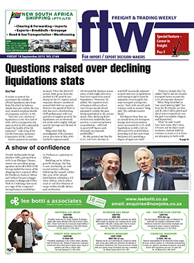 18 Sep 2015 View PDF DUTY CALLS 18 Sep 2015 Clarity on customs Bills expected at Saaff congress 18 Sep 2015 How serious is SA about FDI? 18 Sep 2015 SA port costs about a lot more than statistics 18 Sep 2015 Companies must buy into long-term benefits of training 18 Sep 2015 Government clampdown on credentials cheats welcomed 18 Sep 2015 New STS cranes ready for action soon 18 Sep 2015 Preparing matriculants for the jobs market 18 Sep 2015 Logistics major switches to 'efficient, cost-effective' rail option 18 Sep 2015 Leverage mobile technology to attract new talent 18 Sep 2015 Possible solutions 18 Sep 2015 In-depth study reveals impact of congestion on reefers 18 Sep 2015 LAST WEEK'S TOP STORIES ON FTW ONLINE 18 Sep 2015 Sugar cane could unlock massive biofuel potential 18 Sep 2015 Five-year wait for deeper berths 18 Sep 2015 Energy sector critical to rand's recovery 18 Sep 2015 A show of confidence 18 Sep 2015 Durban dredging affects CT volumes 18 Sep 2015 Growing call for in-house training 18 Sep 2015 Workplace simulation ensures students are ready for action 18 Sep 2015 Questions raised over declining liquidations stats 18 Sep 2015 Regulator to consider TNPA's proposed 5.0% tariff hike 18 Sep 2015 IR solutions need skilled 'drivers' 18 Sep 2015 Rand weakness affects THC comparison 18 Sep 2015 New strategies needed to address skills shortage 18 Sep 2015