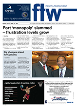 19 Jun 2009 View PDF Environment and safety standards recognised 19 Jun 2009 Viticulture initiative for Tanzania 19 Jun 2009 Vehicle forwarding specialists set up lobbying body 19 Jun 2009 SA business lambasted for silence on country’s future 19 Jun 2009 New feeder service for Walvis Bay 19 Jun 2009 Big changes ahead for Customs 19 Jun 2009 No furore over Merchandise Act 19 Jun 2009 Airline industry to cap carbon emissions 19 Jun 2009 Port ‘monopoly’ slammed – frustration levels grow 19 Jun 2009 New e-learning programme quick off the mark 19 Jun 2009 DUTY CALLS 19 Jun 2009