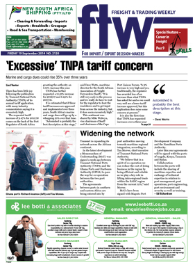 19 Sep 2014 ‘Get the basics right’ 19 Sep 2014 No more one size-fits-all cover 19 Sep 2014 DUTY CALLS 19 Sep 2014 TPT responds over Navis crash 19 Sep 2014 Surprises in port privatisation debate 19 Sep 2014 Shipping holds key to distance selling 19 Sep 2014 In-demand staff call the salary shots 19 Sep 2014 LAST WEEK'S TOP STORIES ON FTW ONLINE 19 Sep 2014 IT skills gaps widens 19 Sep 2014 Change of tactic needed 19 Sep 2014 'Growing perception of freight as exciting career opportunity' 19 Sep 2014 TALKING INSURANCE 19 Sep 2014 Stricter import controls 19 Sep 2014 'Tighten up supply chain security' 19 Sep 2014 Widening the network 19 Sep 2014 Closing the skills gaps 19 Sep 2014 Industry backs multipurpose licence application 19 Sep 2014 Supply chain course on offer 19 Sep 2014 Customs capacity-building programme launched 19 Sep 2014 ‘Excessive’ TNPA tariff concern 19 Sep 2014 OBITUARY 19 Sep 2014 Women make their mark 19 Sep 2014 Sales skills sought after 19 Sep 2014 ‘Interesting opportunities for graduates’ 19 Sep 2014 Recruiter launches permanent placements 19 Sep 2014