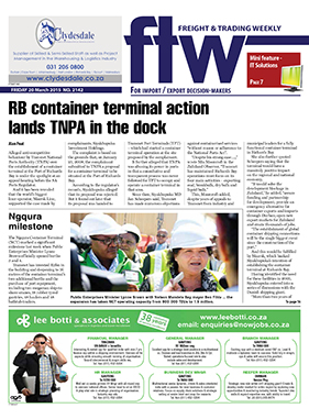 20 Mar 2015 New product provides integrated airfreight solutions 20 Mar 2015 Integration is the name of the game 20 Mar 2015 IT systems evolving to deliver further value to customers 20 Mar 2015 Cape route to lose lustre as new Canals dig deep? 20 Mar 2015 LAST WEEK'S TOP STORIES ON FTW ONLINE 20 Mar 2015 Food exports to Swaziland rise 40% 20 Mar 2015 Jo’burg office adds local support 20 Mar 2015 SA Shippers’ Council sets new collaborative path 20 Mar 2015 Transnet spells out Salisbury Island plans 20 Mar 2015 Ngqura milestone 20 Mar 2015 IT apathy grounds airfreight growth 20 Mar 2015 A ‘Classic’ gets a facelift 20 Mar 2015 Own Africa offices on the cards for Ziegler 20 Mar 2015 TNPA to invest R13b in Saldanha facilities 20 Mar 2015 Shipper questions 'opaque' quarterly BAF procedure 20 Mar 2015 Exploration stutters as junior miners feel the pinch 20 Mar 2015 New product helps protect temp-sensitive cargo 20 Mar 2015 RB container terminal action lands TNPA in the dock 20 Mar 2015 Maximising functionality 20 Mar 2015 DUTY CALLS 20 Mar 2015 Zambia mining row 20 Mar 2015 Duty collection via credit card in the pipeline 20 Mar 2015 Counting the cost of Ebola 20 Mar 2015 The reality behind the sliding rand 20 Mar 2015 Online shopers want free delivery 20 Mar 2015 Keeping tabs on visitors gets more effective 20 Mar 2015
