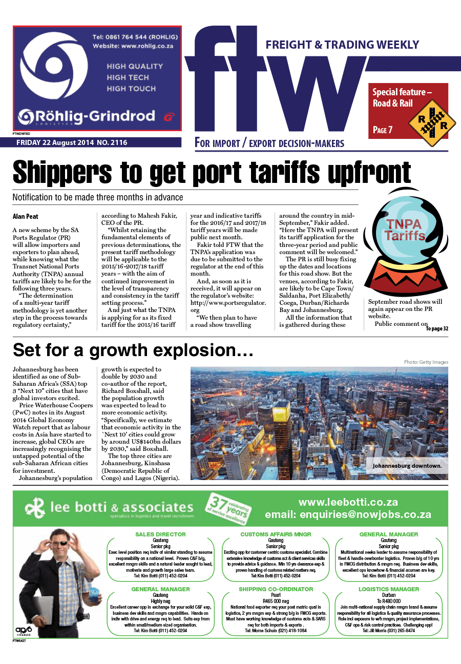 22 Aug 2014 Afric's road dangers 22 Aug 2014 Swaziland banks on railways to mitigate Agoa blow 22 Aug 2014 TRF wants R100bn from private investors 22 Aug 2014 'Productivity is the bottom line for investors' 22 Aug 2014 Reefer form set to streamline logistics 22 Aug 2014 'Red tape biggest NTB headache' 22 Aug 2014 TALKING INSURANCE 22 Aug 2014 FTW THIRSTY'S 22 Aug 2014 ‘Roadfreight rates must rise’ 22 Aug 2014 Second new dredger arrives 22 Aug 2014 DUTY CALLS 22 Aug 2014 Set for a growth explosion… 22 Aug 2014 Zim to sign major rail upgrade deal 22 Aug 2014 Rail's MISSING LINE = market share 22 Aug 2014 LAST WEEK'S TOP STORIES ON FTW ONLINE 22 Aug 2014 Thousands of metres of storage created in Ndola 22 Aug 2014 Tolls on the increase to address dire infrastructure needs 22 Aug 2014 Experts weigh in on impact on SA of Chinese slowdown 22 Aug 2014 Expect more tolls in Africa 22 Aug 2014 Corruption stunts investments in Africa 22 Aug 2014 SA no longer the only gateway 22 Aug 2014 Technology powers up Zimbabwe's ailing railway system 22 Aug 2014 'Carbon tax will raise costs, reduce efficiencies' 22 Aug 2014 Zambia launches $51m mobile comms system 22 Aug 2014 Depot facilities to be developed 22 Aug 2014 'Rail often more expensive than road' 22 Aug 2014 Overborder retailers stick with road for reliability 22 Aug 2014 Russian sanctions a windfall for SA perishable exporters? 22 Aug 2014 New locomotive strategy will sharpen efficiencies 22 Aug 2014 Trucking company set to grow African footprint 22 Aug 2014 Congestion hikes costs 22 Aug 2014 Moz takes ownership of new locos 22 Aug 2014 Freight industry liquidations drop 22 Aug 2014 Rail reaches out to co-operate with traditional competitors 22 Aug 2014 Hotline exposes truck hijack hotspots 22 Aug 2014 LETTER 22 Aug 2014 TK line makes headway 22 Aug 2014 Shippers to get port tariffs upfront 22 Aug 2014 War of words over Cape tolls continues 22 Aug 2014 Border delay solutions ‘critical’ 22 Aug 2014
