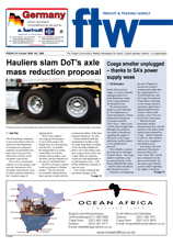 23 Oct 2009 View PDF Rail champion spells out carbon ‘cost’ of road usage 23 Oct 2009 New overnight service caters for fragile cargo 23 Oct 2009 EgyptAir to convene world conference 23 Oct 2009 Hauliers slam DoT’s axle mass reduction proposal 23 Oct 2009 Emirates expects balanced loads on Durban route 23 Oct 2009 Crisis plan moves into gear as CT congestion continues 23 Oct 2009 Coega smelter unplugged – thanks to SA’s power supply woes 23 Oct 2009 DAL expands Mediterranean coverage 23 Oct 2009 Ignorance of the law is no excuse 23 Oct 2009 New appointment adds muscle to airfreight consolidator 23 Oct 2009 Discrepancy between fruit packed and shipped raises concern 23 Oct 2009 The new GIG ... 23 Oct 2009 Reader query provides insight into Sars’ duty policy for travellers 23 Oct 2009 Walvis Bay to invest a further R1.8bn 23 Oct 2009 Reefer exports kick-start expected upturn 23 Oct 2009 Deadline looms for complaints about ports authority 23 Oct 2009 An entire career with one employee … 23 Oct 2009 DUTY CALLS 23 Oct 2009
