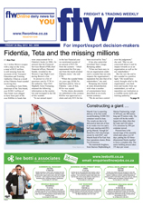 24 May 2013 View PDF Fidentia, Teta and the missing millions 24 May 2013 LAST WEEK'S TOP STORIES ON FTW ONLINE 24 May 2013 Cargocare raises the bar 24 May 2013 Productivity jumps as new cranes move into action 24 May 2013 Framework for PPPs under way – Molefe 24 May 2013 Maersk returns Q1 profits 24 May 2013 CT service offers significant benefits to express oerators 24 May 2013 Nazdarovye! 24 May 2013 Monthly bunker update from Cockett Marine 24 May 2013 ICS gears up to handle cargo on a grand scale 24 May 2013 Sanral set for R816-m upgrade in Durban 24 May 2013 Africa’s project cargo spurs growth in air express sector 24 May 2013 Air charter company launches broker service 24 May 2013 Mozambican coal line reopens 24 May 2013 Security dealine kicks in 24 May 2013 Express major spells out ambitious Africa growth plans 24 May 2013 ‘Reliable systems critical to success of express cargo market' 24 May 2013 'Africa is diversifying away from commodities' 24 May 2013 Constructing a giant … 24 May 2013 Simplicity and reliability keep customers happy 24 May 2013 DUTY CALLS 24 May 2013 Navis glitches – no gain without pain 24 May 2013 Upbeat outlook for express sector 24 May 2013 Rwanda opportunities beckon 24 May 2013