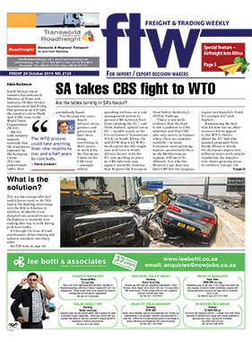 24 Oct 2014 Illicit importers up to new tricks 24 Oct 2014 LAST WEEK'S TOP STORIES ON FTW ONLINE 24 Oct 2014 Freighter charters support Ebola efforts 24 Oct 2014 Zim cottons on to clothing export strategy 24 Oct 2014 Industry missing out on financial benefits of accreditation 24 Oct 2014 Horror crash highlights need to jack up standards 24 Oct 2014 DUTY CALLS 24 Oct 2014 Cross-border projects create opportunities for local insurers 24 Oct 2014 Mining sector keeps airfreight demand buoyant 24 Oct 2014 Express cargo records double-digit growth 24 Oct 2014 Ebola restricts DRC drivers 24 Oct 2014 African operators adopt ‘aerotropolis’ model 24 Oct 2014 Taxes keep planes airborne 24 Oct 2014 Retailers queueing up to enter the continent 24 Oct 2014 'Ships designed for Africa' come into their own 24 Oct 2014 SAA aims for 65% market share 24 Oct 2014 Billions being invested in African airports 24 Oct 2014 Upbeat outlook 24 Oct 2014 Saldanha Bay port expansion makes headway 24 Oct 2014 Postal strike - the impact 24 Oct 2014 Air cargo flying high in Africa 24 Oct 2014 Cement producers await anti-dumping verdict 24 Oct 2014 Recycling project pumps up over-border trucking volumes 24 Oct 2014 Pricing and capacity challenge airfreight operators 24 Oct 2014 Growing economic imbalances threaten growth 24 Oct 2014 SA takes CBS fight to WTO 24 Oct 2014 Copper classification conundrum 24 Oct 2014 Liability issues raised following ship grounding incidents 24 Oct 2014 Big growth in pharma 24 Oct 2014 City of CT fires another salvo in battle with Sanral 24 Oct 2014