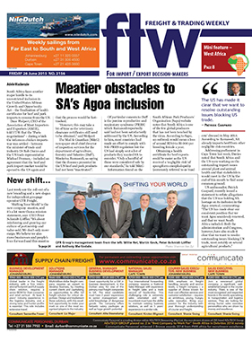 26 Jun 2015 Exports to Nigeria affected by oil price 26 Jun 2015 Multi-purpose market shows signs of growth 26 Jun 2015 Sweet investment for Nigeria 26 Jun 2015 Are SMMEs disadvantaged by 'big business' focus? 26 Jun 2015 'Buy Namibian' drive works 26 Jun 2015 LAST WEEK'S TOP STORIES ON FTW ONLINE 26 Jun 2015 DUTY CALLS 26 Jun 2015 Meatier obstacles to SA's Agoa inclusion 26 Jun 2015 Global forwarders fail to meet on-line business needs 26 Jun 2015 Airfreight gives small-to-medium-sized forwarders a lift 26 Jun 2015 Dredging finally under way at CT terminal 26 Jun 2015 Twenty years of constructive problem solving 26 Jun 2015 SA will feel impact of Angolan import quotas 26 Jun 2015 RFA spells out the crippling cost implications of truck ban 26 Jun 2015 Groupage volumes by sea show growth 26 Jun 2015 New customs system clogs up Zambian border 26 Jun 2015 E-commerce growth creating opportunties for SA exporters 26 Jun 2015 Single-window trade portal 26 Jun 2015 Industry sings the economic blues as it battles sustainability 26 Jun 2015 Unroadworth truck claims challenged 26 Jun 2015 2015 not an 'easy year' for Africa 26 Jun 2015 Construction starts on new Angolan port 26 Jun 2015 CTCT pioneers pre-trip inspection facility 26 Jun 2015 'Per project' outsourcing reduces hassle 26 Jun 2015 DubeTradeport CEO fired 26 Jun 2015 New shift… 26 Jun 2015 Biometrics help support trade 26 Jun 2015 Live ammo lands businessman in customs pickle 26 Jun 2015 Investment in infrastructure could create 'ports race' 26 Jun 2015