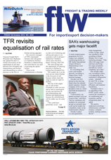 26 Oct 2012 View PDF SACD to open high-security warehouse 26 Oct 2012 Telematics takes tracking to a new level 26 Oct 2012 "Why user-pay system trumps fuel levy argument' 26 Oct 2012 'Transport for CT programme will ultimately benefit freight' 26 Oct 2012 Transnet and Swazi Rail - latest 26 Oct 2012 Gigaba sets out SAA's tale of woe 26 Oct 2012 Sars fraudster nailed 26 Oct 2012 'No shortage of rail wagons on Natcor' 26 Oct 2012 Reefer rate hike 'flawed' in context of SA citrus trade 26 Oct 2012 TPT spells out overstay policy during truckers' strike 26 Oct 2012 Wine industry shifts to bulk solutions 26 Oct 2012 SA-Moz MoU - no joint ventures at this stage 26 Oct 2012 'Container conversions still cooking' 26 Oct 2012 Government suspends Smit Amandla probe 26 Oct 2012 Groupage operator set to grow business from Italy 26 Oct 2012 Durban hub sees increase in transhiments 26 Oct 2012 CRF adds capacity from LA 26 Oct 2012 Charter specialist expands OBC service 26 Oct 2012 The road versus rail debate continues ... 26 Oct 2012 EU advance notification system beds down smoothly 26 Oct 2012 SAA'S warehousing gets major facelift 26 Oct 2012 TFR revisits equalisation of rail rates 26 Oct 2012 DUTY CALLS 26 Oct 2012