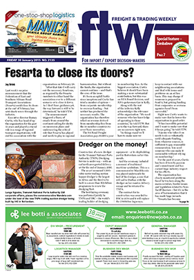 30 Jan 2015 Fesarta to close its doors? 30 Jan 2015 Cape Town to Harare in under 24 hours 30 Jan 2015 Top young freight forwarder named 30 Jan 2015 Commercial clearance guidelines online 30 Jan 2015 Helping enhance efficiency of cross-border trade 30 Jan 2015 Freight World opens Jo’burg office 30 Jan 2015 Trade outlook ‘bleak’ 30 Jan 2015 Freight still moving after deadly Malawi floods 30 Jan 2015 Zimra gets tough on smuggling 30 Jan 2015 DUTY CALLS 30 Jan 2015 Polish airline targets export cargo 30 Jan 2015 TFR rates unchanged by fuel price dive 30 Jan 2015 Sculptors master the art of logistics 30 Jan 2015 New project cargo company launched 30 Jan 2015 Positioned to keep freight moving 30 Jan 2015 Economy heading for all-time low 30 Jan 2015 Zimbabwe's worring trade deficit 30 Jan 2015 Major funding needed to restore railways 30 Jan 2015 Getting back to basic training 30 Jan 2015 New ruling could force switch to seafreight 30 Jan 2015 Value-added service for Zimbabwean artists 30 Jan 2015 Dredger on the money! 30 Jan 2015 China competing head-on with South Africa for Zimbabwean trade 30 Jan 2015 Farmers call for ban on milk imports 30 Jan 2015 Guesthouse caters for business visitors 30 Jan 2015 Borrowed forklifts offload blocks of stone 30 Jan 2015 Zimbabwe at forefront of industry training - SFAAZ 30 Jan 2015 West Africa the world's fastest-growing trade 30 Jan 2015 TALKING INSURANCE 30 Jan 2015 Zim logistics costs amongst highest in region 30 Jan 2015 Forum brings together state and private sector 30 Jan 2015 Online tracking keeps shippers in the know 30 Jan 2015 Zim's mining industry set to contract this year 30 Jan 2015 Industry monitors DRC violence 30 Jan 2015 Port of Beira aggressively pursues Zim business 30 Jan 2015 Manufacturers face uphill battle 30 Jan 2015 Emerging markets look to Zim for tobacco 30 Jan 2015 SA remains top trading partner 30 Jan 2015 Consultancy saves R200m to project clent 30 Jan 2015 Not a market for sissies! 30 Jan 2015 New trailers deliver higher payloads 30 Jan 2015 Sugar exports turn sour 30 Jan 2015 LAST WEEK'S TOP STORIES ON FTW ONLINE 30 Jan 2015 Fuel price volatility forces rethink of all-in rate strategy 30 Jan 2015 Corpses cost thousands 30 Jan 2015
