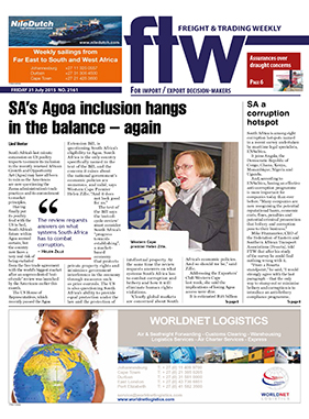 31 Jul 2015 SA a corruption hotspot 31 Jul 2015 SA's Agoa inclusions hangs in the balance - again 31 Jul 2015 It's back to original BoLs in Angola 31 Jul 2015 'Court action keeps CT roads congested' 31 Jul 2015 No chance of all-in rates for sea 31 Jul 2015 Safety coordination centre responds to threats 31 Jul 2015 Signs of recovery in Somalian economy 31 Jul 2015 Brics bank now official 31 Jul 2015 DAL adds feeder to Egypt 31 Jul 2015 Professional maritime body launched 31 Jul 2015 DUTY CALLS 31 Jul 2015 Western Cape plans halaal logistics hub 31 Jul 2015 Nugeria attempts an image makeover 31 Jul 2015 TNPA offers assurances over draught concerns 31 Jul 2015 LAST WEEK'S TOP STORIES ON FTW ONLINE 31 Jul 2015 Dry dock repair plans get resounding thumbs up 31 Jul 2015