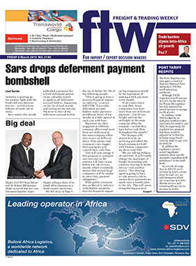 6 Mar 2015 Sars drops deferement payment bombshell 6 Mar 2015 LAST WEEK'S TOP STORIES ON FTW ONLINE 6 Mar 2015 Trade logistics ignored in budget 6 Mar 2015 PORT TARIFF RESPITE 6 Mar 2015 TALKING INSURANCE 6 Mar 2015 Black-owned consortium buys into Ziegler 6 Mar 2015 DUTY CALLS 6 Mar 2015 Stepping up… 6 Mar 2015 Trade barriers stymie intra-Africa air growth 6 Mar 2015 Are Gauteng's expansion plans based on flawed data? 6 Mar 2015