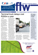8 Feb 2013 View PDF Little sign of a solution to Bayhead Road potholes 8 Feb 2013 Western Cape calls for trucker self-regulation 8 Feb 2013 RFA fights inspection charges 8 Feb 2013 TNPA knocks R312 off tariff for import TEUs 8 Feb 2013 DUTY CALLS 8 Feb 2013 Turners gets Level 3 accreditation 8 Feb 2013 New equipment helps truckers cut costs and enhance safety 8 Feb 2013 Sars makes progress in under-valuation battle 8 Feb 2013 'Perceptions about Africa changing' 8 Feb 2013 NileDutch goes weekly on West Africa service 8 Feb 2013 Terminal truck delays cost R200m a year 8 Feb 2013 SA port stats reflect slim increase 8 Feb 2013 LAST WEEK'S TOP STORIES ON FTW ONLINE 8 Feb 2013