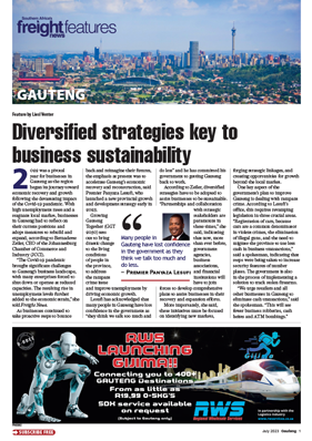20 Jul 2023 View PDF Ford ramps up production at Tshwane facility 20 Jul 2023 AfCFTA Gauteng roadmap to boost province’s growth aspirations 20 Jul 2023 JCCI assists SMEs with business mentorship and export training 20 Jul 2023 Innovative service uses Gautrain for deliveries 20 Jul 2023 Major arterial roads being built or upgraded 20 Jul 2023 Diversified strategies key to business sustainability 20 Jul 2023