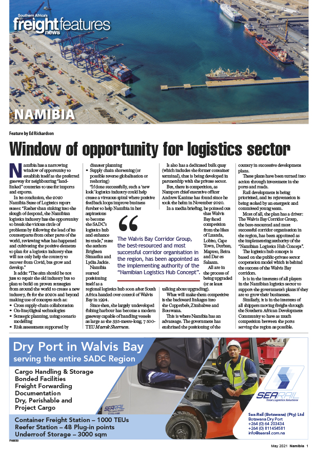 27 May 2021 View PDF Airfreight kept mines operating during Covid lockdown 27 May 2021 ‘Amazing customers’ behind the success of forwarding company 27 May 2021 TransNamib to pull itself into profit 27 May 2021 Delivering world-class road management 27 May 2021 May 2021 Namibia 17FN9084P O Box 90546, WindhoekWindhoek Show GroundsJan Jonker RoadWindhoek, NAMIBIATel: +264 (0)61 41 11 00Cell: +264 (0)81 724 3169eMail: info@nla.org.naNamibiaLogisticsAssociationFrom the Industry for the IndustryOn the road to becom 27 May 2021 Road transporters delivering despite challenges – NLA 27 May 2021 Trans-Kalahari Corridor recovering from Covid-19 27 May 2021 Namport focusing on efficiencies 27 May 2021 Keeping the lights on 27 May 2021 Focus on cutting border red tape 27 May 2021 Covid-19 highlights role of logistics sector 27 May 2021 Growing copper demand good news for corridors 27 May 2021 Logistics sector holds key to recovery 27 May 2021 Sulphur helping to balance Walvis Bay road freight 27 May 2021 Growing demand for commodity certification 27 May 2021 IMF $270 million injection to fight Covid-19 27 May 2021 Multimodal transfer equipment could see more freight on rail 27 May 2021 Doing business getting easier 27 May 2021 Opportunity to create a smart corridor 27 May 2021 Mobile clinics keep trucks moving 27 May 2021 ‘Narrow window’ for establishing logistics hub 27 May 2021 Connected for e-commerce 27 May 2021 Roads safer during Covid-19 27 May 2021 Namport increases volumes despite pandemic 27 May 2021 Window of opportunity for logistics secto 27 May 2021
