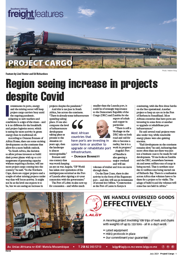 22 Jul 2021 View PDF July 2021 Project Cargo 19Project specialist opens Moz office 22 Jul 2021 Dedicated rail link connects Maputo port with Zim trade hubs 22 Jul 2021 Project cargo is risky business – and a full understanding is critical 22 Jul 2021 Packaging of the main vaccines 22 Jul 2021 Covid vaccines – rollout is a giant project 22 Jul 2021 Renewable energy sparks demand 22 Jul 2021 Demand exceeds capacity supply 22 Jul 2021 Recent insurrection makes every shipment an ‘abnormal load’ 22 Jul 2021 Mozambican LNG plans grind to a halt 22 Jul 2021 Foreign direct investment as barometer 22 Jul 2021 July 2021 Project Cargo 11Breadbox invests in Dakar terminal 22 Jul 2021 ‘Jumbo’ joint venture expands service range 22 Jul 2021 ‘Projects must be bankable from the start’ 22 Jul 2021 Power generation concessions a bright light for SA cargo scene 22 Jul 2021 Smart cities not passing the grade 22 Jul 2021 Renewables create new playing field 22 Jul 2021 The logistics behind Africa’s biggest refinery – a new quay and super heavy-lift ring cranes 22 Jul 2021 Multipurpose vessels back in fashion – for now 22 Jul 2021 Africa’s top mega projects to drive demand for project services 22 Jul 2021 Growth of SEZs creates opportunities in breakbulk sector 22 Jul 2021 Region seeing increase in projects despite Covid 22 Jul 2021