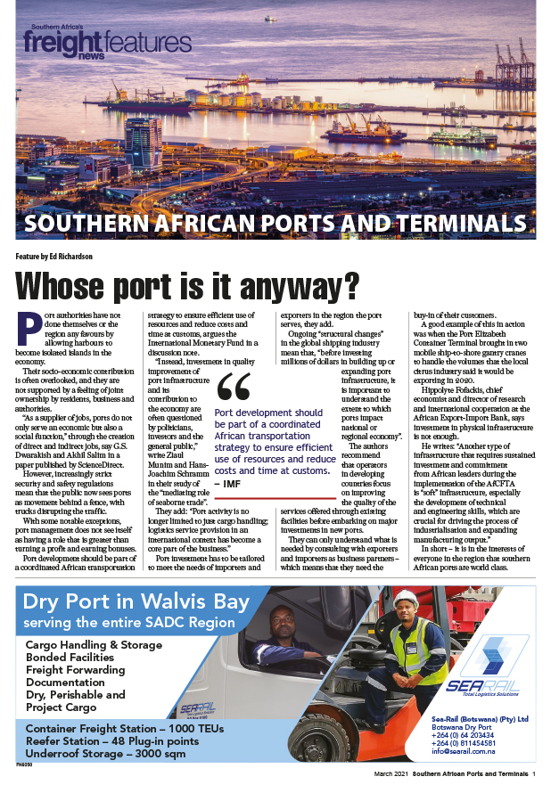 4 Mar 2021 View PDF Best connected ports 4 Mar 2021 No sign of move to inland ports drying up 4 Mar 2021 AfDB backing corridor approach for economic development 4 Mar 2021 Cost of doing business too high 4 Mar 2021 Region faces daunting climate change challenges 4 Mar 2021 Whose port is it anyway? 4 Mar 2021