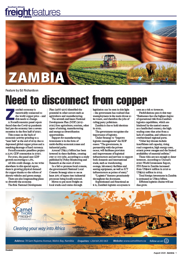 27 Aug 2020 View PDF The dirty side of clean energy 27 Aug 2020 Low road haulage rates unsustainable 27 Aug 2020 Infrastructure shortages dampen DRC’s economic development 27 Aug 2020 Beira traffic healthy during Covid 27 Aug 2020 The lowdown on clearing Zambian imports 27 Aug 2020 Plans afoot for upgrades to Nacala rail line 27 Aug 2020 Electric future for Zambian Copperbelt 27 Aug 2020 Youthful shoots for agriculture 27 Aug 2020 New perishables capacity for Zambia 27 Aug 2020 Shippers and transporters benefit from corridor membership 27 Aug 2020 Covid-19 increases need for tracking devices 27 Aug 2020 Trade flows reflect Zambia’s connectivity to the continent 27 Aug 2020 Renewed focus on Sesheke ‘short cut’ 27 Aug 2020 Covid-19 points way to more efficient logistics 27 Aug 2020 Logistics investment helps drive down costs of doing business 27 Aug 2020 Freight forwarder records growth during Covid crisis 27 Aug 2020 Katanga consolidations out of Dubai 27 Aug 2020 Fast-tracking FERI certificates 27 Aug 2020 NCT achievements in first year of operation 27 Aug 2020 Walvis Bay container terminal establishes itself as a key gateway 27 Aug 2020 NAC2000 officially opens new warehouse 27 Aug 2020 Haulier records zero losses on main routes 27 Aug 2020 Zambian exports and imports in 2019 27 Aug 2020 Zambian economy could rebound in 2021 27 Aug 2020 Safety first for airfreight 27 Aug 2020 Walvis Bay corridor best in region – AUC 27 Aug 2020 Need to disconnect from copper 27 Aug 2020